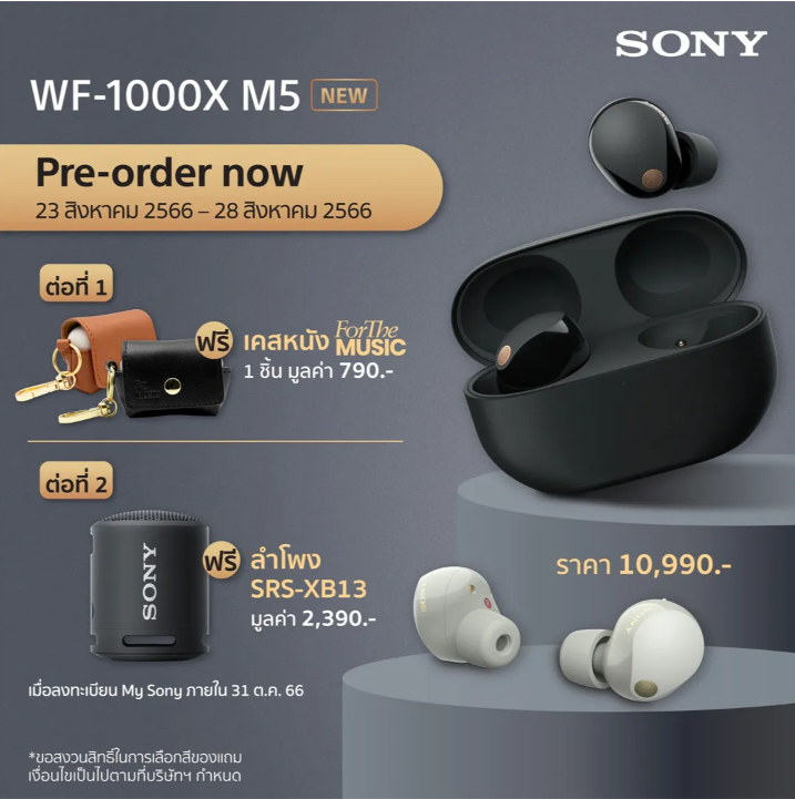 Sony ประเทศไทย จัดโปรโมชันพรีออร์เดอร์ Sony WF-1000XM5 ระหว่างวันที่ 23 – 28 สิงหาคม ราคา 10,990 บาท โดยมีของสมนาคุณดังนี้